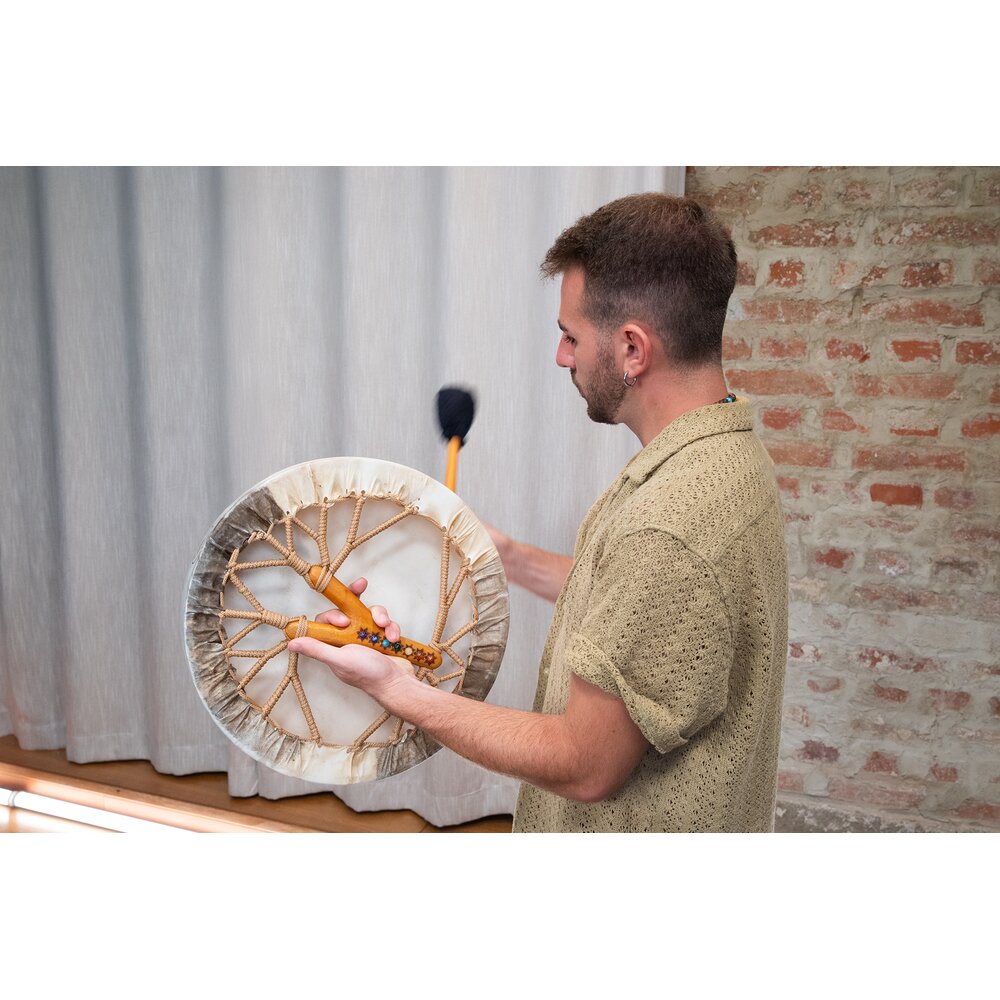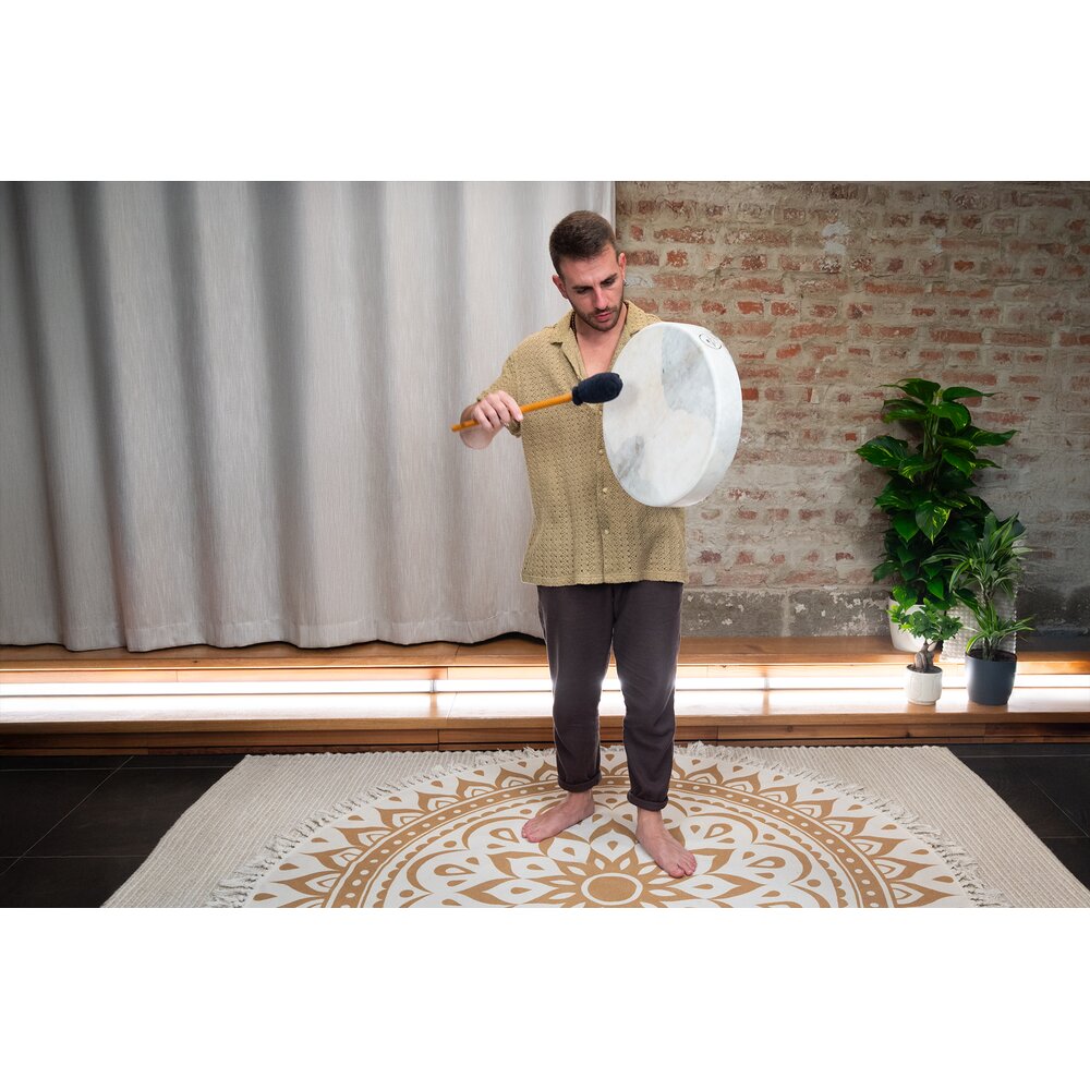 O Meinl Sonic Energy Spirit Drum é um tambor de moldura tradicional com aparência e toque autênticos. Sua pele natural de cabra produz tons quentes e terrosos que podem se assemelhar ao ritmo constante de um batimento cardíaco — um som frequentemente usado em práticas xamânicas ou jornadas sonoras para criar atmosferas meditativas e de conexão com a terra. Cordas de náilon resistentes na parte traseira proporcionam uma empunhadura segura e confortável, facilitando o toque com o martelo incluso ou com as mãos. Cada tambor vem com uma bolsa macia para armazenamento e transporte seguros.