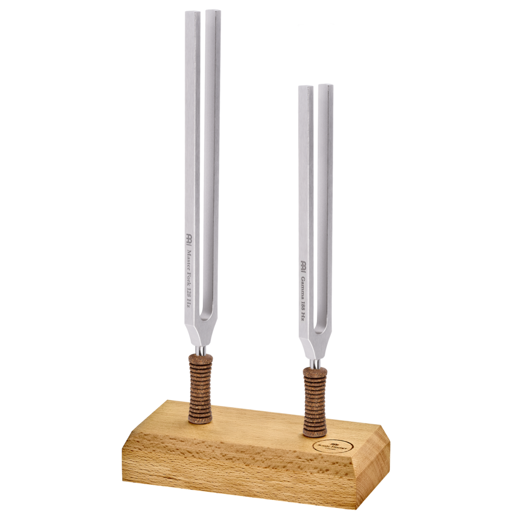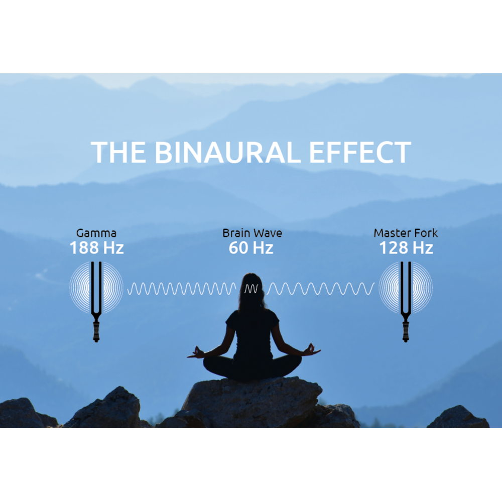 To create the binaural effect, activate the Binaural Therapy Tuning Fork and the Master Fork 128 Hz and hold them to the right and left ear. The brain will recognize the difference between the two frequencies, perceiving a third frequency that guides you into the desired brain wave state.