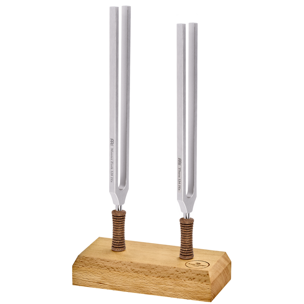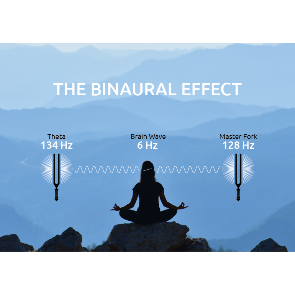 To create the binaural effect, activate the Binaural Therapy Tuning Fork and the Master Fork 128 Hz and hold them to the right and left ear. The brain will recognize the difference between the two frequencies, perceiving a third frequency that guides you into the desired brain wave state.